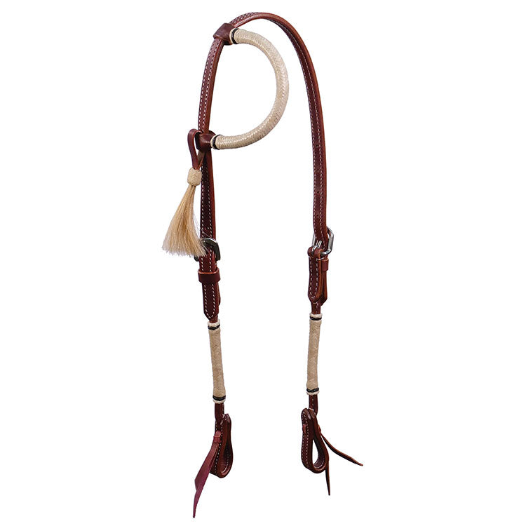 2-Ply latigo leather one ear with round natural rawhide brow/one ear and cheek pieces with dark rawhide accents, horse hair tassel and our leather tie, easy change bit keeper.