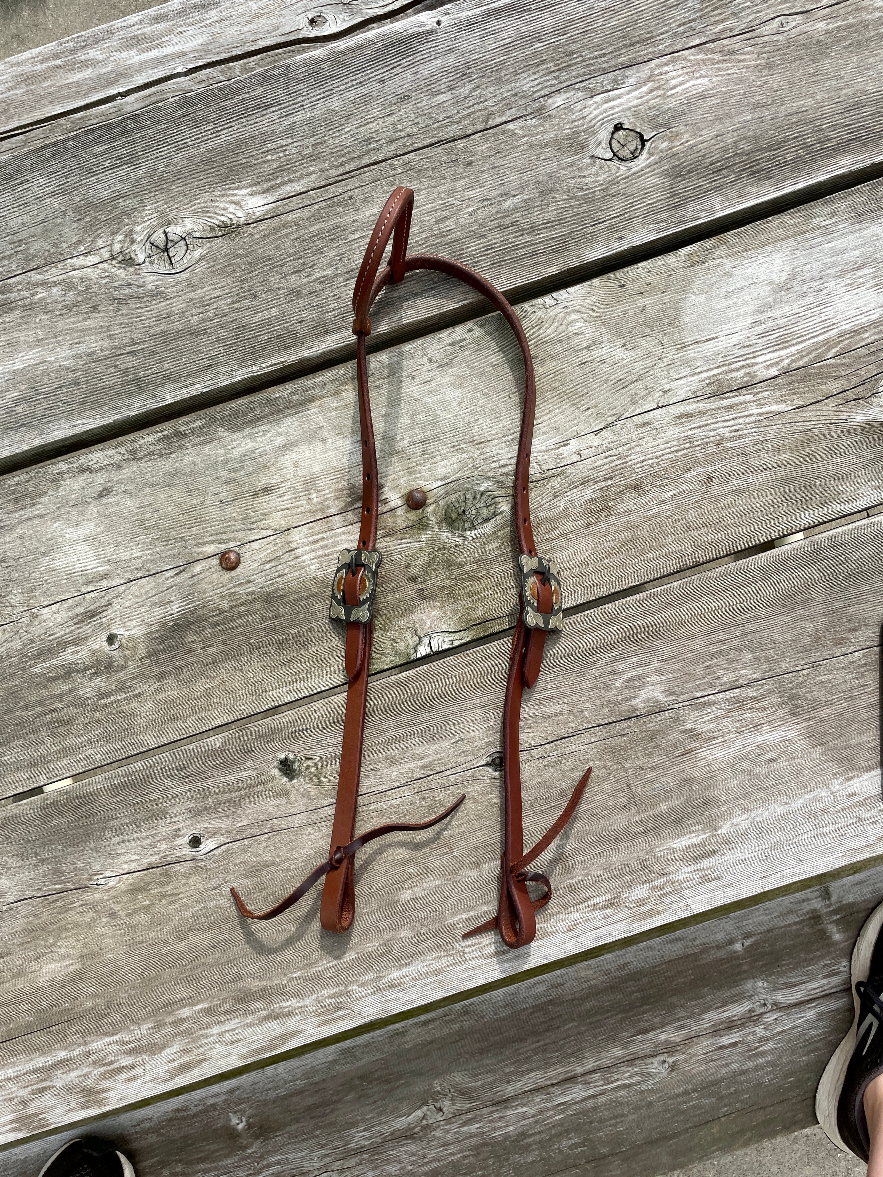 Oiled Harness One Ear Headstall with Antique Sunflower Buckle presents not just a piece of tack, but a statement of style and quality for the discerning equestrian. Meticulously crafted from high-grade oiled harness leather, this headstall boasts durability and a classic appeal that enhances with age. The leather, known for its robust and flexible nature, promises to withstand the rigors of daily use while maintaining its rich texture and depth of color.