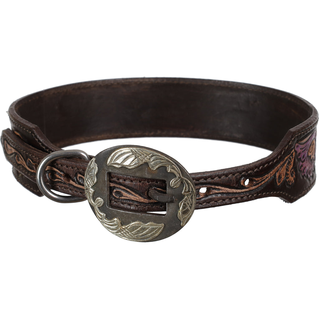Made from dark oiled leather, this collar features medium oiled floral and leaf tooling accented with hand-painted flowers, giving it a beautiful pop of color and personality. The antiqued silver floral buckle