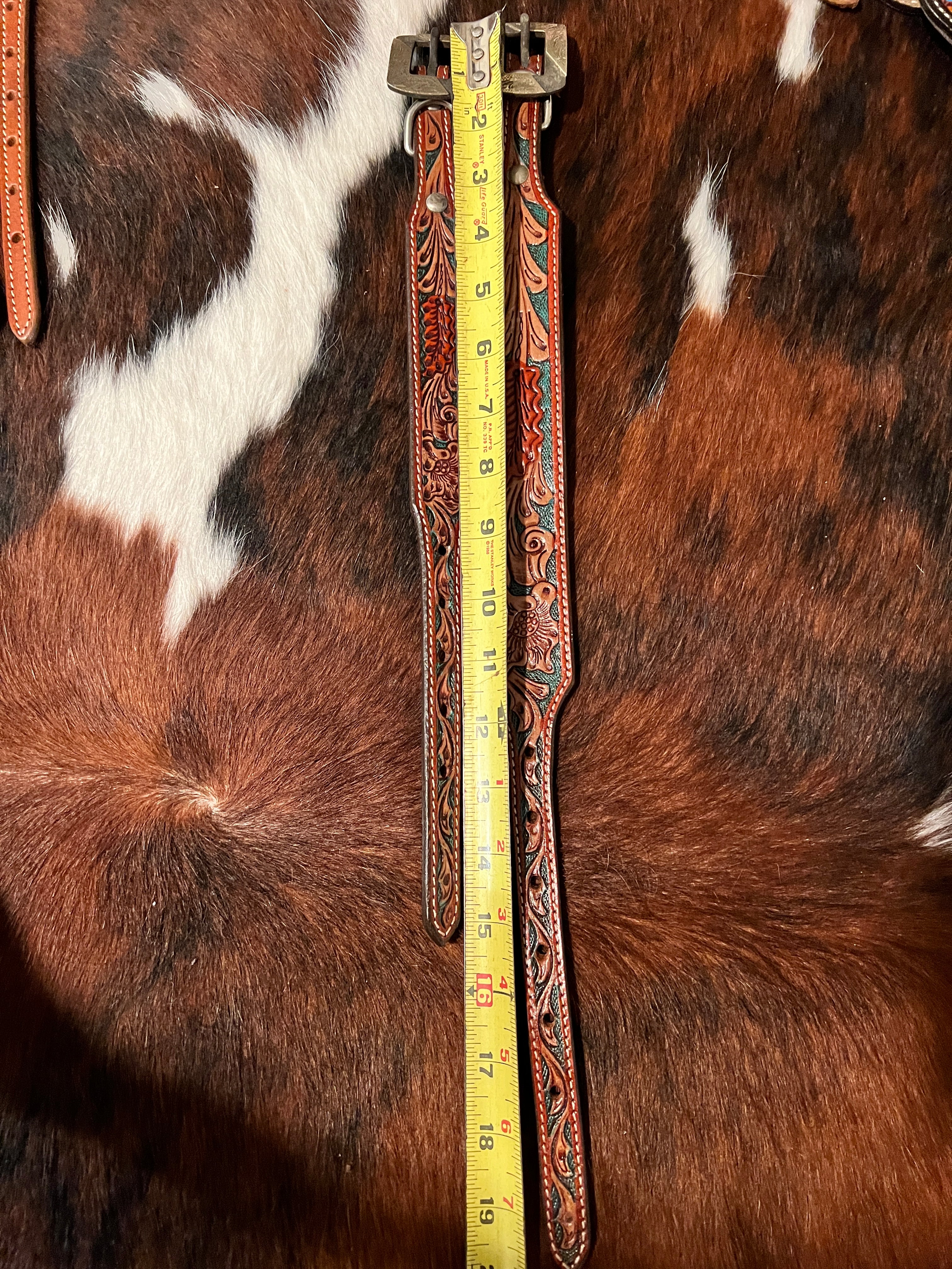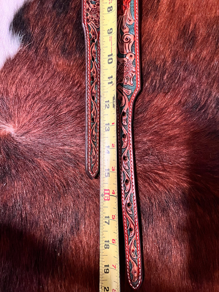 Made from medium oiled leather, this collar features floral and leaf tooling set against a turquoise painted background, creating a beautiful contrast and rustic charm. The antiqued silver bar buckle offers a timeless look