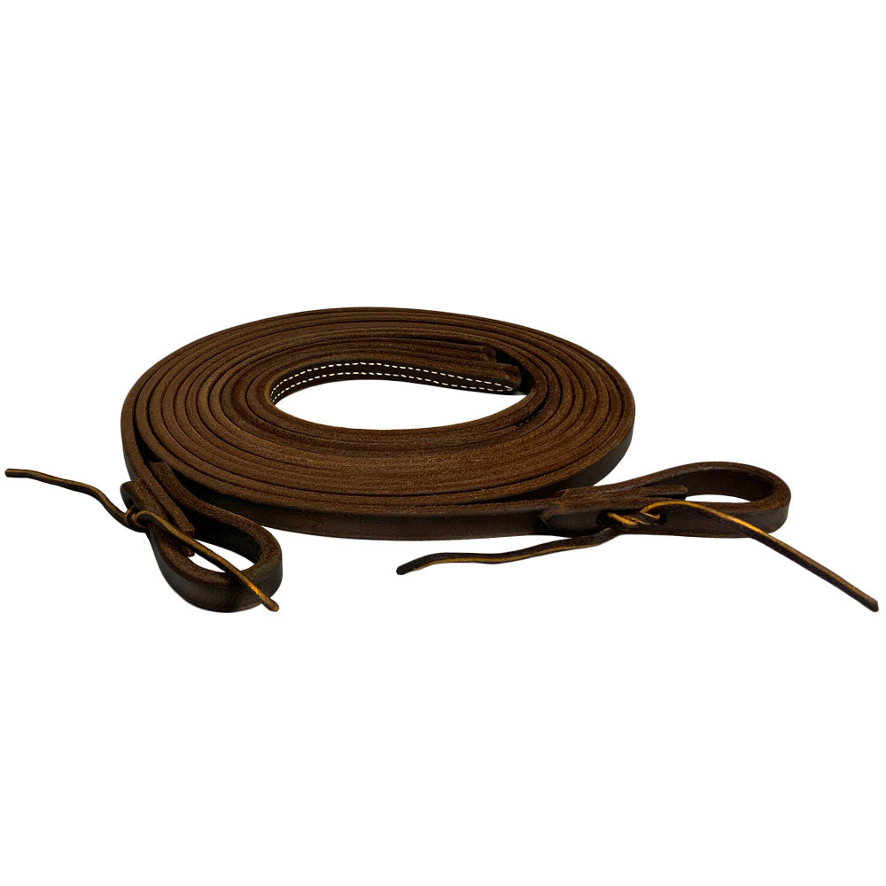 These harness leather split reins are the premier choice for the correct weight and feel in the hand. They feature waterloop ends allowing the rider to change the bit without any tools. Riding with weighted split reins gives your horse slack, helps your horse feel the weight of the reins, and amplifies rider cues because of the weighted drape of the split rein. These oiled harness leather reins will stay soft and protected for years and are perfect for riding events or everyday use!