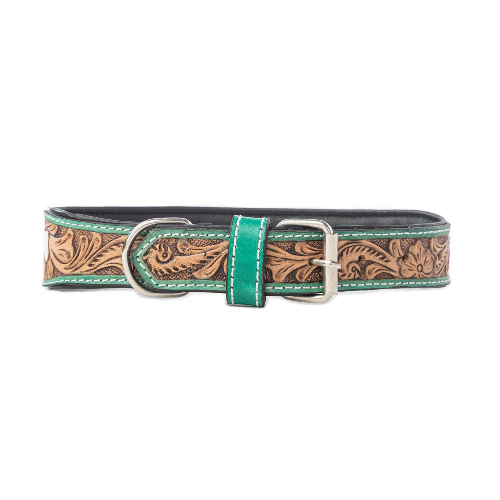 Adorn your faithful companion with our Santa Fe Bone collar. This exquisite accessory features buttery tooled leather framed by vibrant turquoise trim with authentic Southwestern beadwork in striking diamond patterns. The decorative bone motifs add a playful nod to your pup's favourite treats while elevating their style.