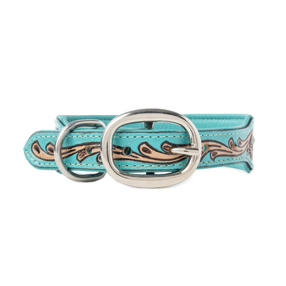 Transform your faithful companion into a Southwest sensation with our Turquoise Sky collar! This stunning accessory features vibrant turquoise leather showcasing intricate hand-tooled floral designs with sparkling crystal accents. The striking color palette creates a perfect backdrop for the detailed Western tooling, delivering both head-turning style and reliable durability for the fashion-forward canine whose human appreciates authentic Western craftsmanship with contemporary flair.