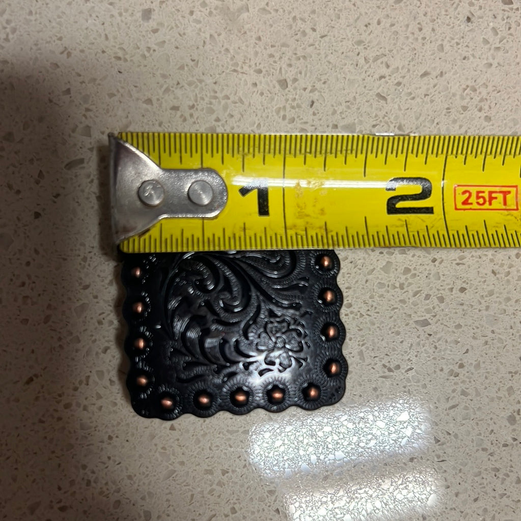 Copper engraved square concho with screw. This copper engraved square replacement concho measures 1-1/4" x 1-1/4".